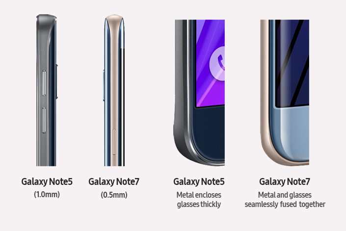 Samsung applied the same radius to the device’s edges on both the front and back of the Galaxy Note7, a different approach than the one used on the Galaxy Note5, which also featured a curved design. This resulted in a device that is perfectly symmetrical—from top to bottom, side to side, and front to back.