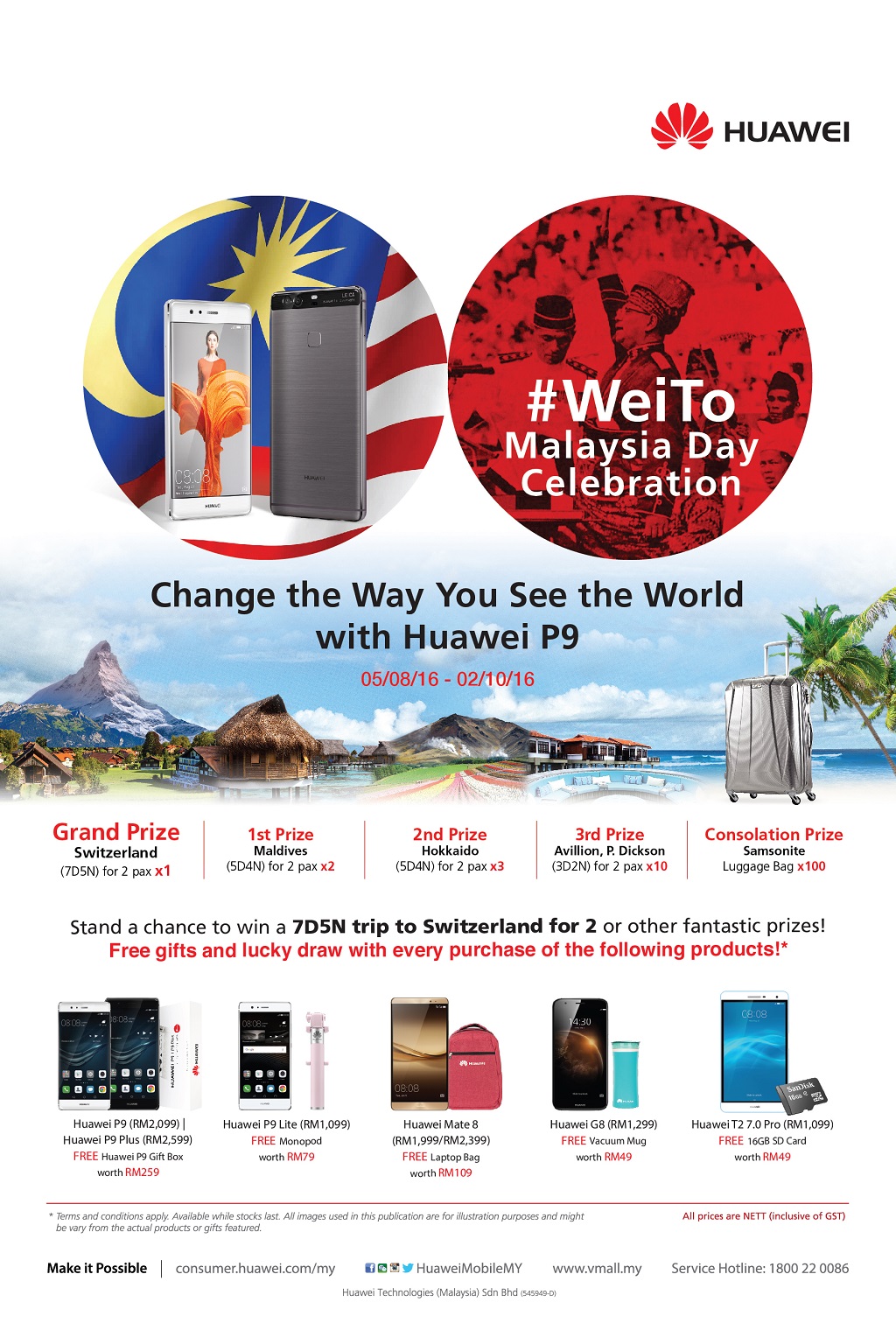 With the Merdeka and Malaysia Day celebration approaching, Huawei Malaysia will be running a special promotion – #WeiTo Malaysia Day Celebration promotion offering its customers more value with premium gifts upon their purchase of selected Huawei devices. The details for the promotion is as below: